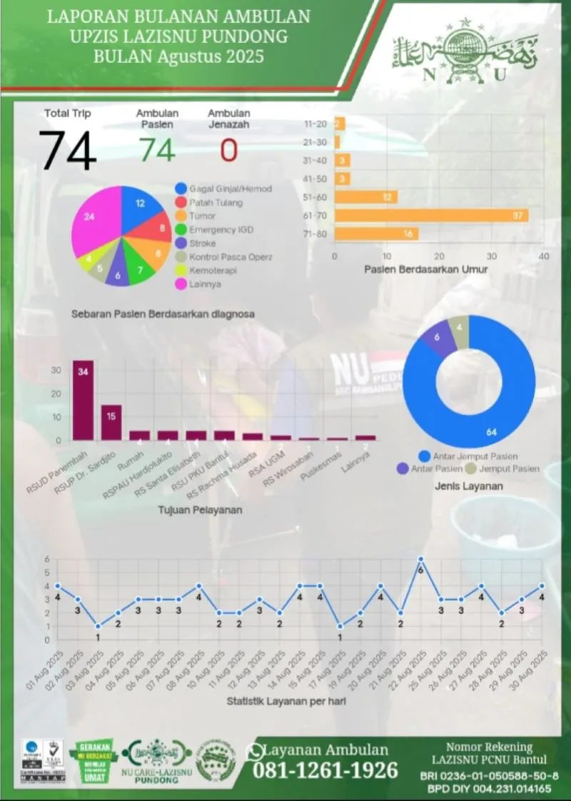 Berdasarkan laporan bulanan Agustus 2025, tercatat sebanyak 74 trip layanan telah diberikan kepada masyarakat yang membutuhkan.